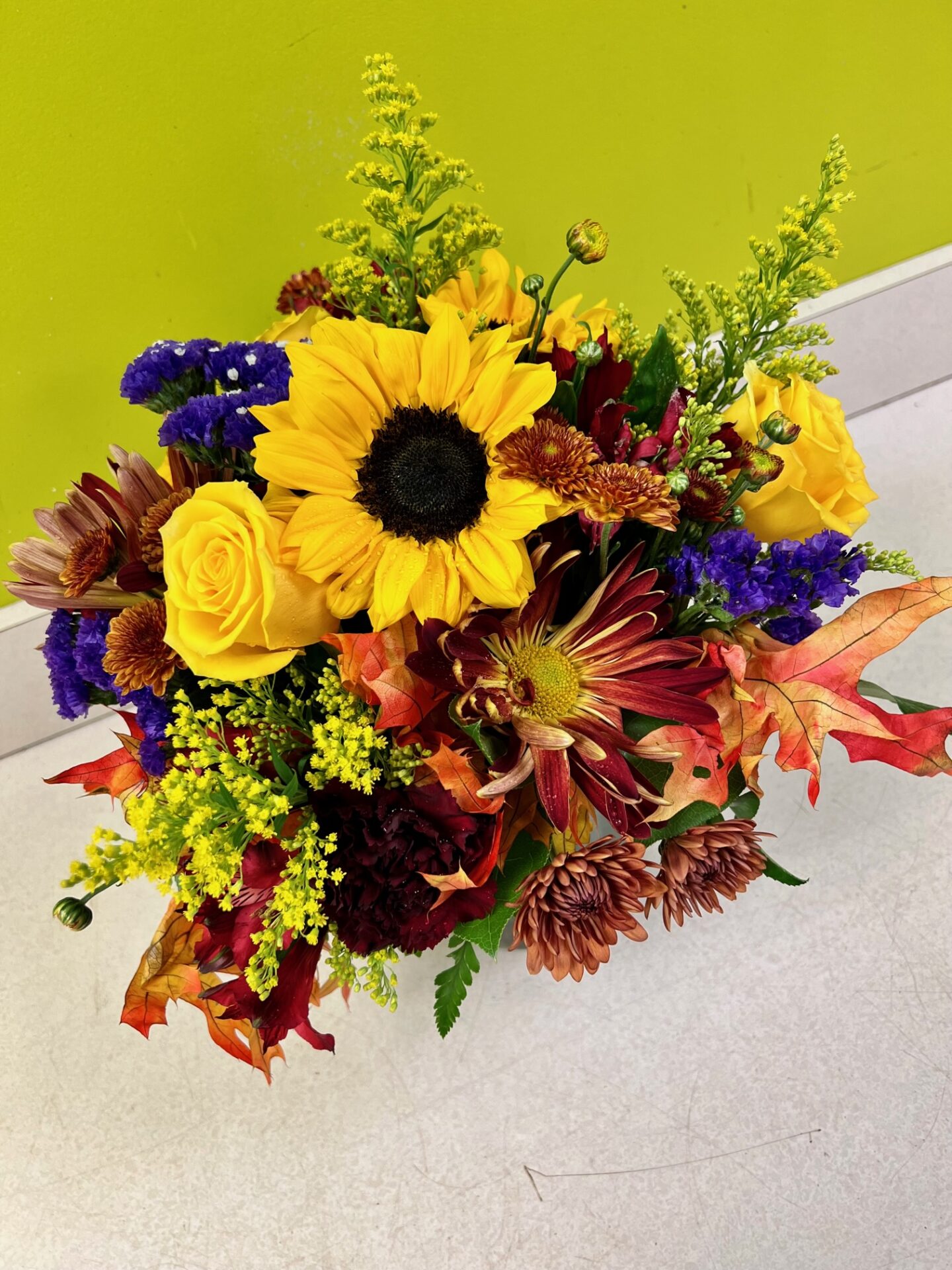 An enjoyable vase of pleasing fall flowers and tones. Great for any autumn occasion.