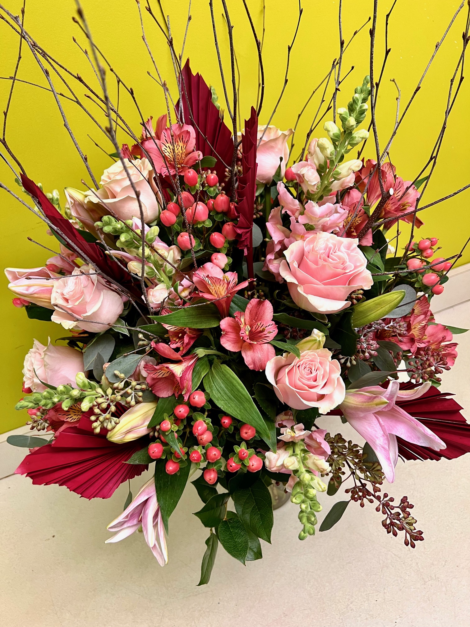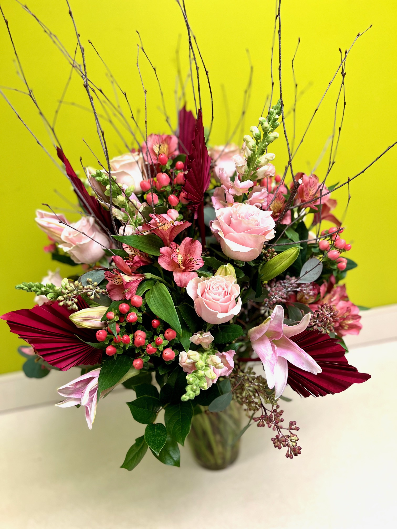 This gorgeous gathering is filled with all things pink. Clusters of roses, berries, alstroemeria, snapdragons, and lilies are set among the tall birch branches for a dramatic look. Send some Love today.