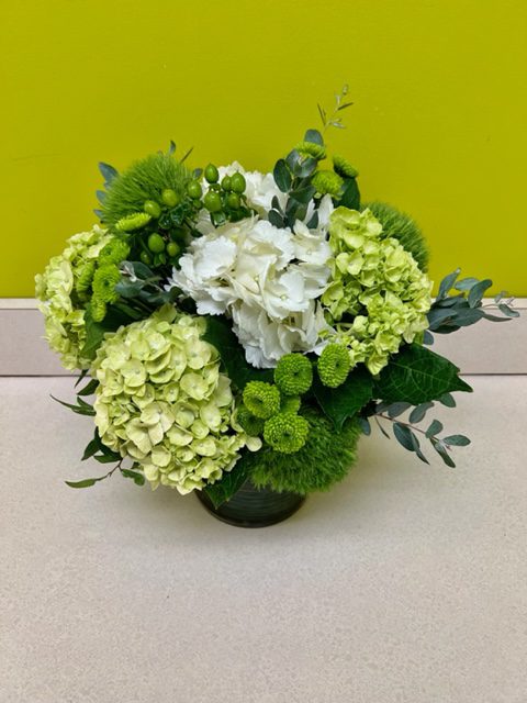 A modern accent for any occasion.This beautiful arrangement blends shades of luch green blossoms in a serene setting.