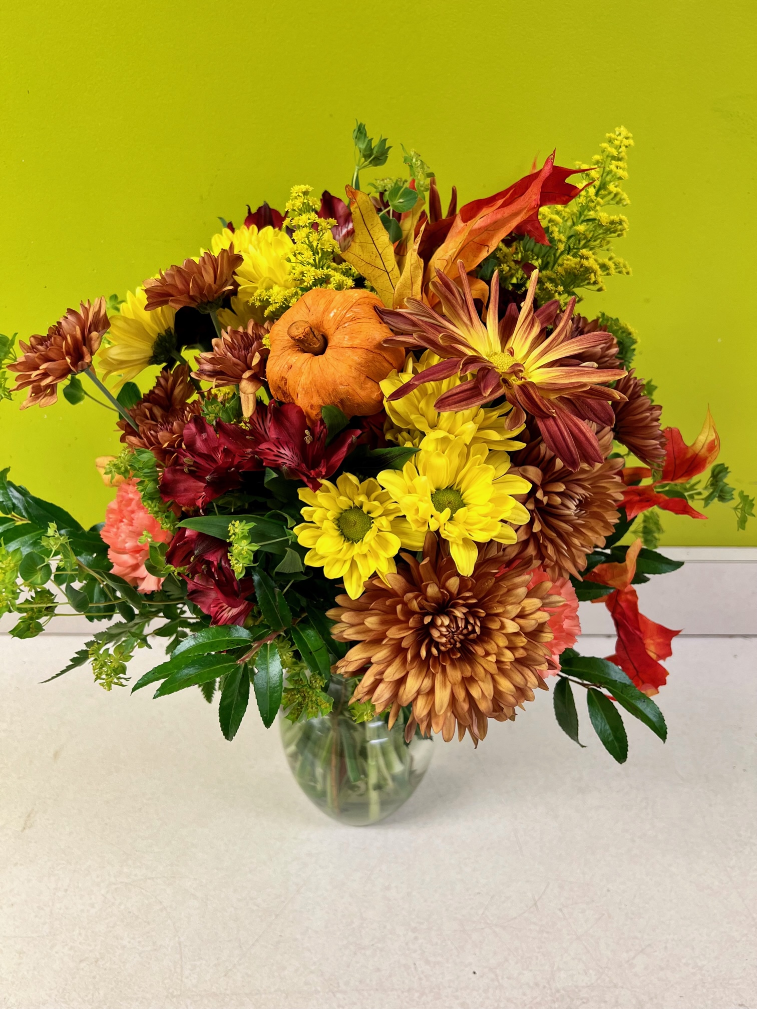 A beautiful arrangement of autumn hues including seasonal blossoms, oak leaves and adorable straw pumpkins.