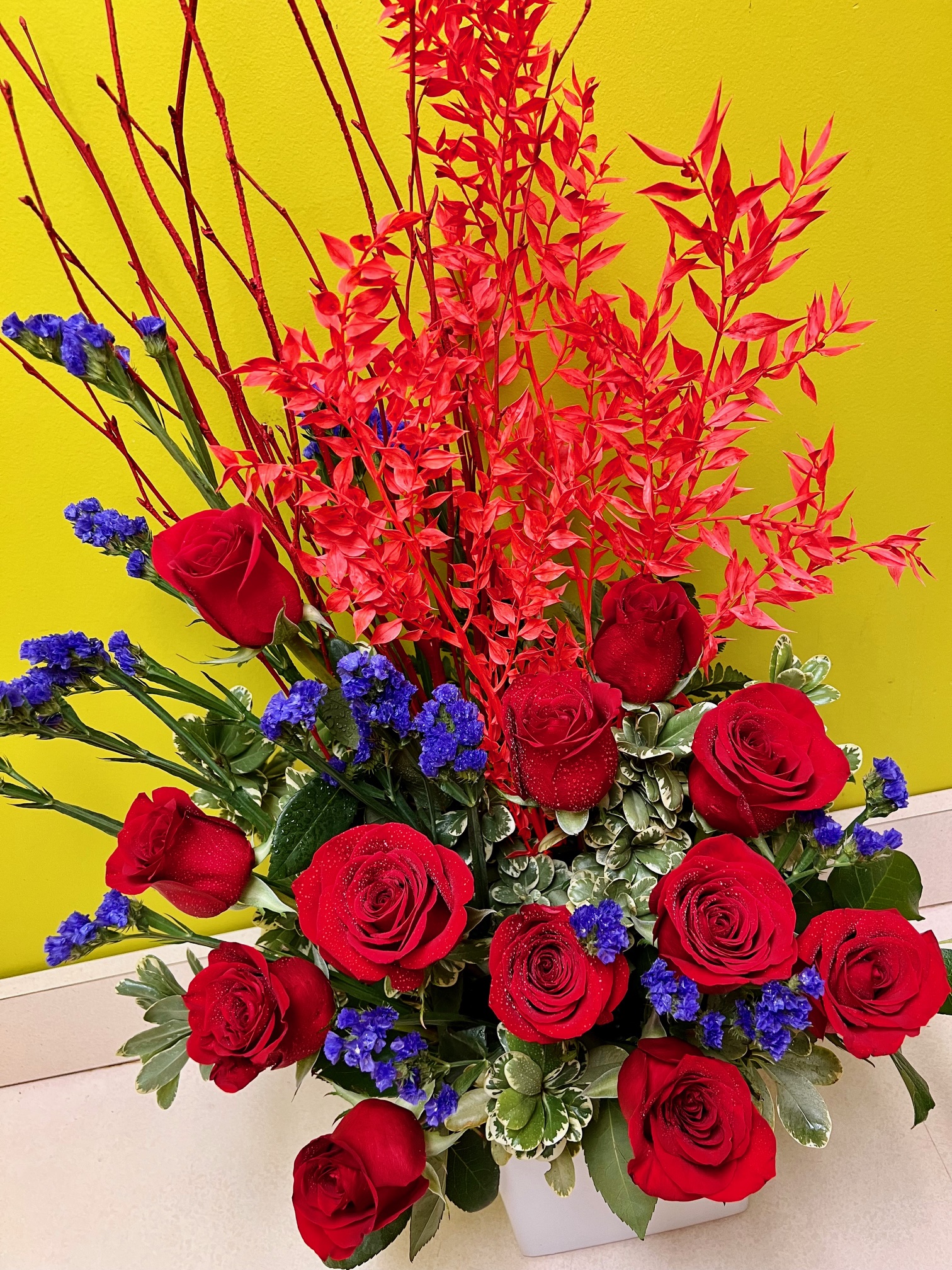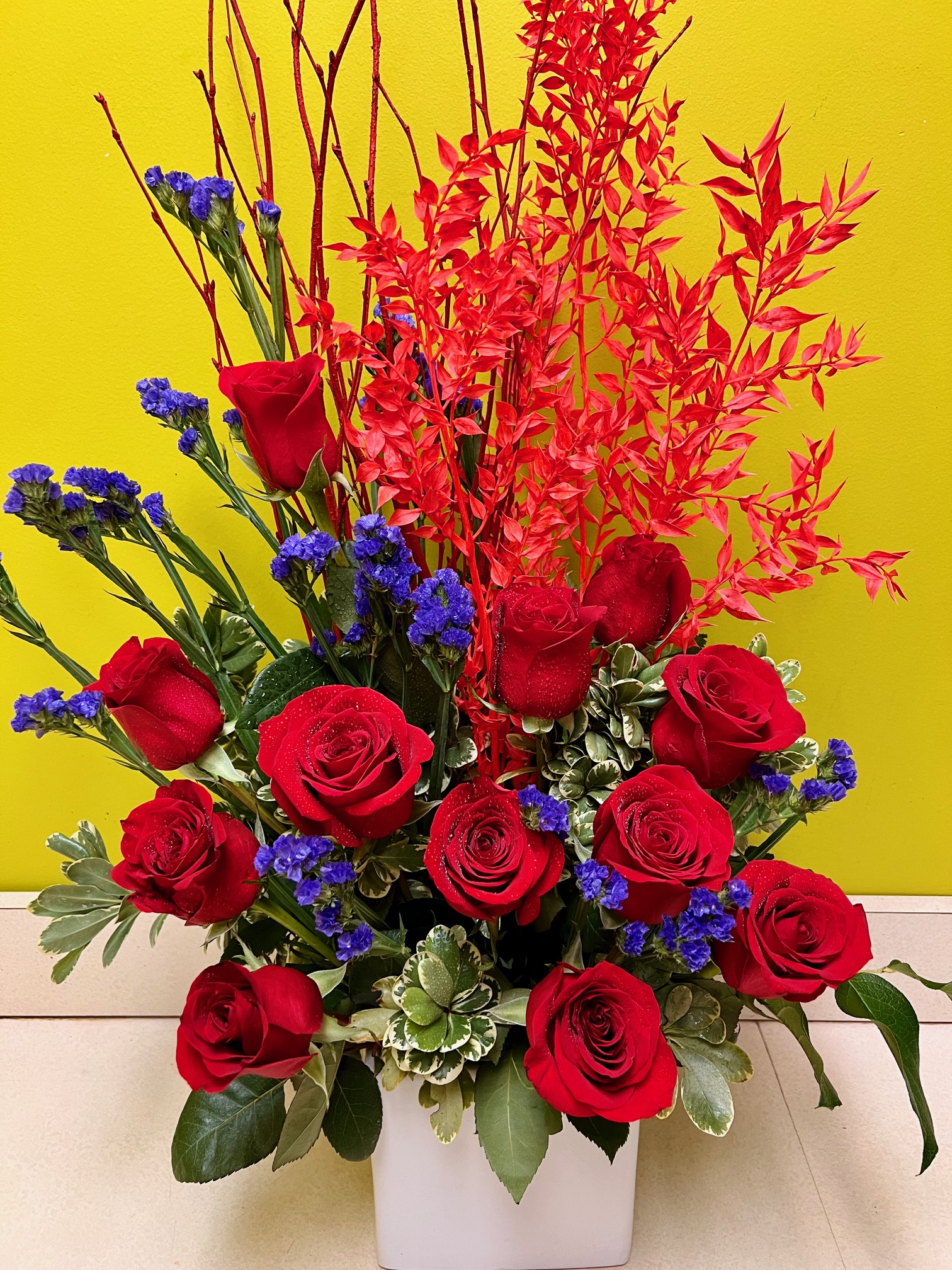 Is your heart on fire? This arrangement captures that same heat and passion with roses designed to feel bold, dramatic, and unforgettable. Choose one dozen or two dozen roses, artfully arranged for a striking, creative look.