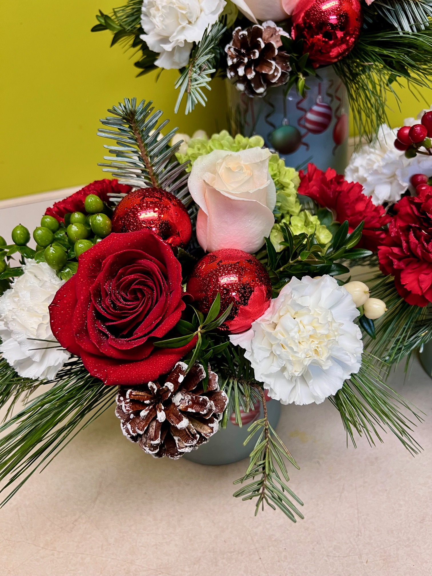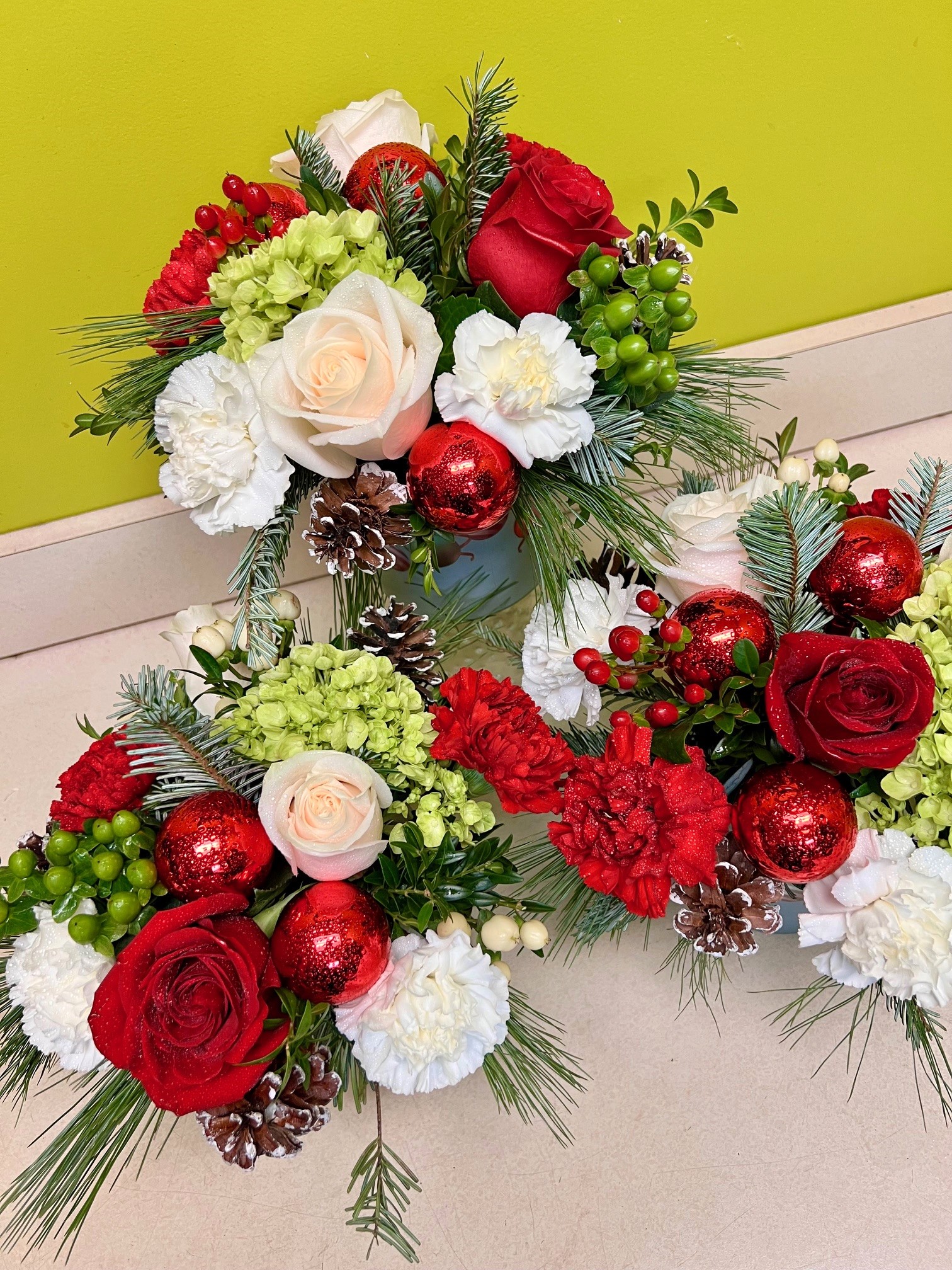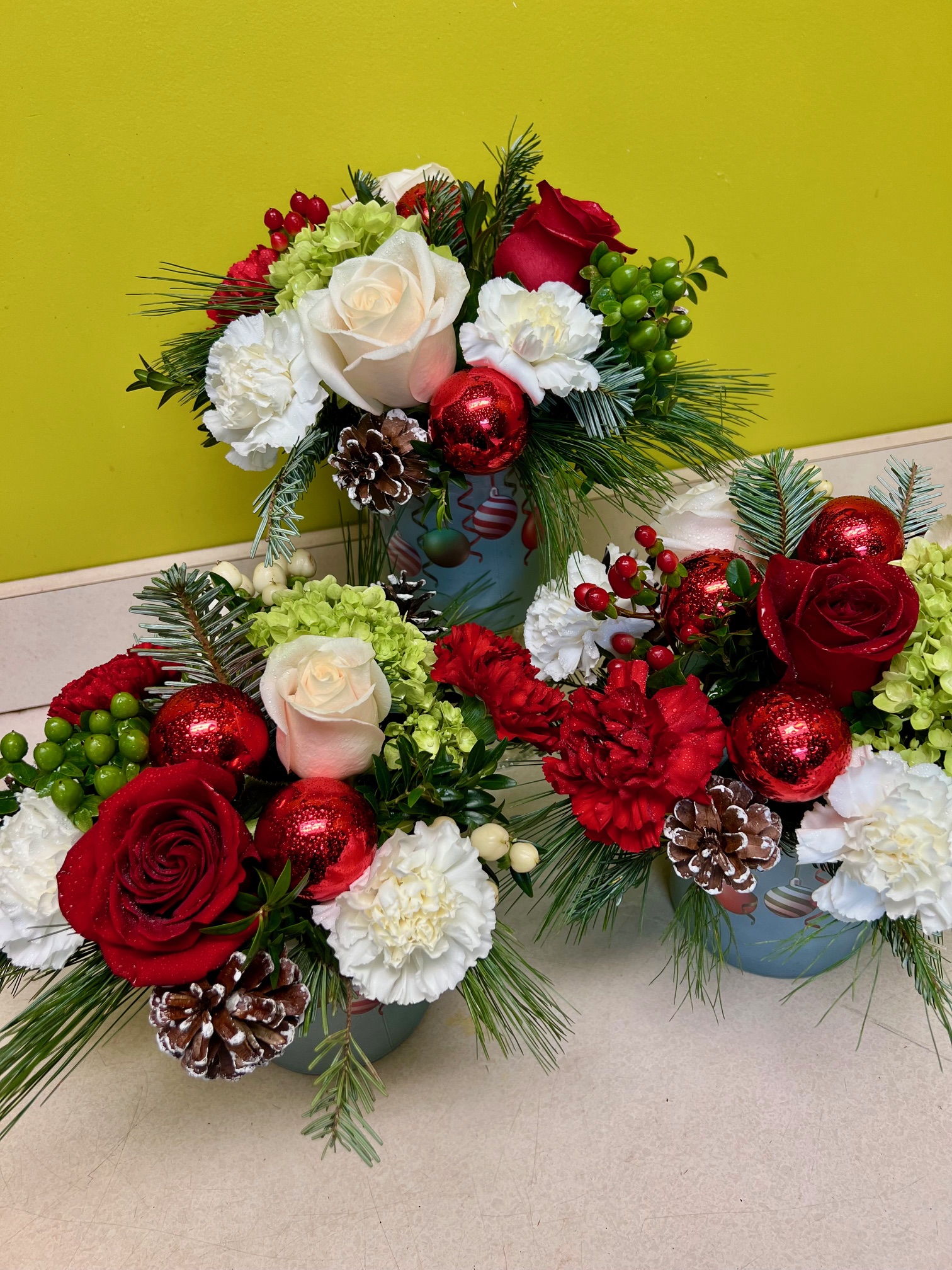 Dress your table in holiday style with this festive trio of seasonal blooms. Featuring red, white, and green flowers accented with clusters of berries, pinecones, and classic Christmas balls, this set brings warmth and charm to your dining table—or can be displayed separately throughout your home for a coordinated holiday look.