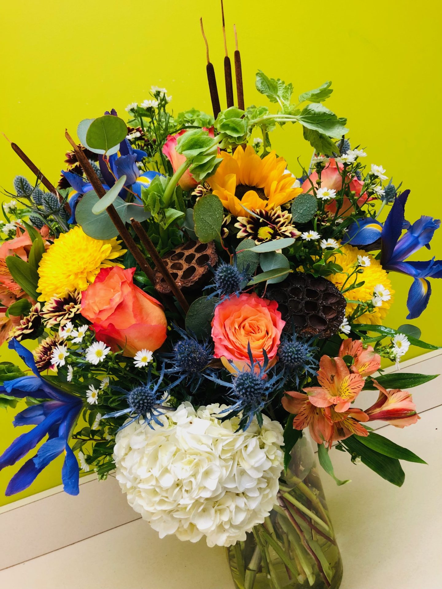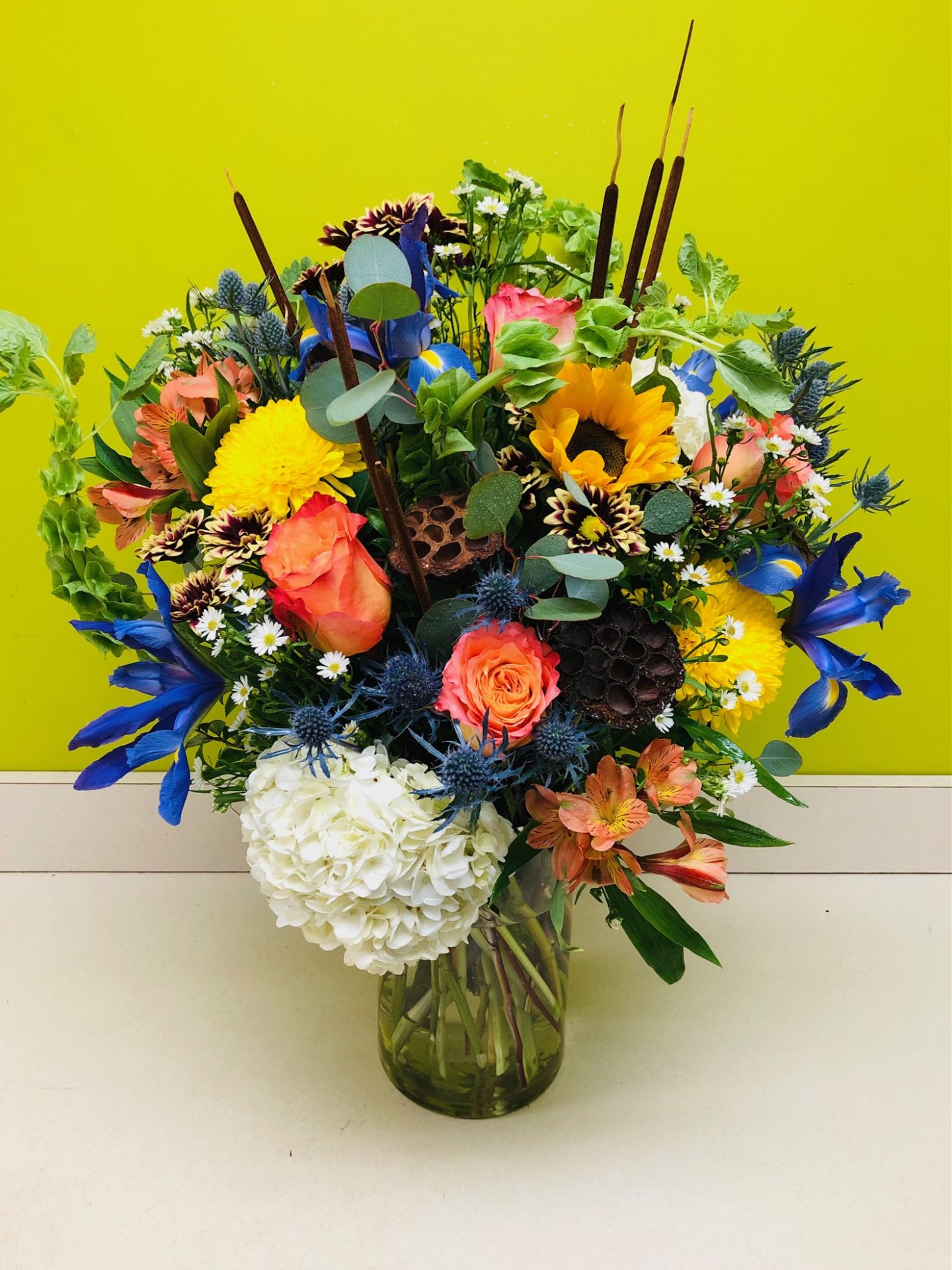 This seasonal arrangement is sure to impress. It’s inspired by cold fall nights! Mixing bold purple iris together with warm amber and golden tones to invoke the warmth of a fire on a chilly autumn night.