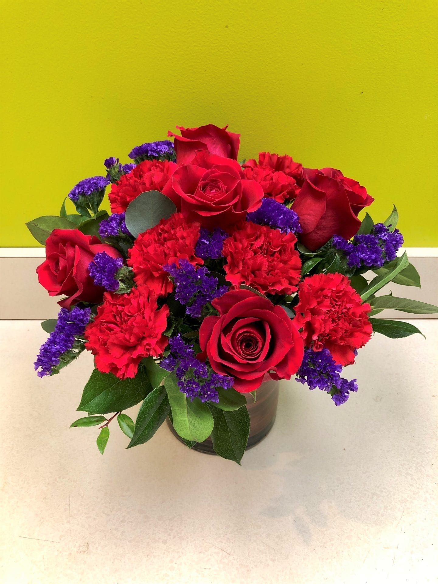 A lovely mix of classic carnations with blooming roses in a low cylinder vase. It’s Just Lovely.