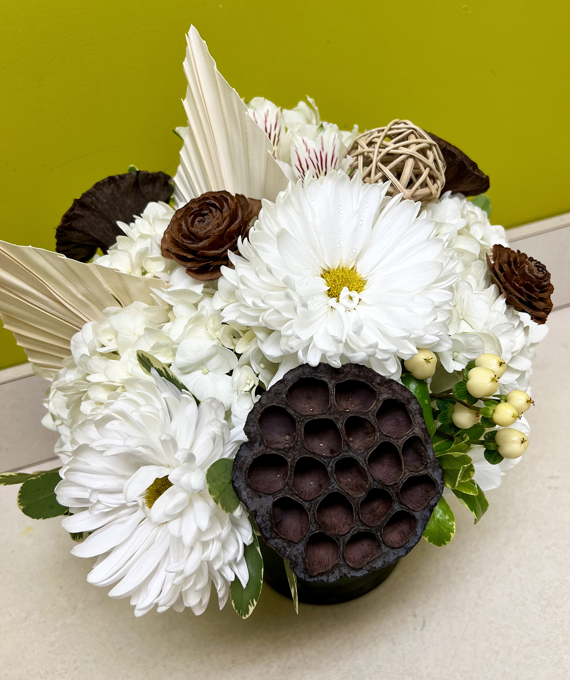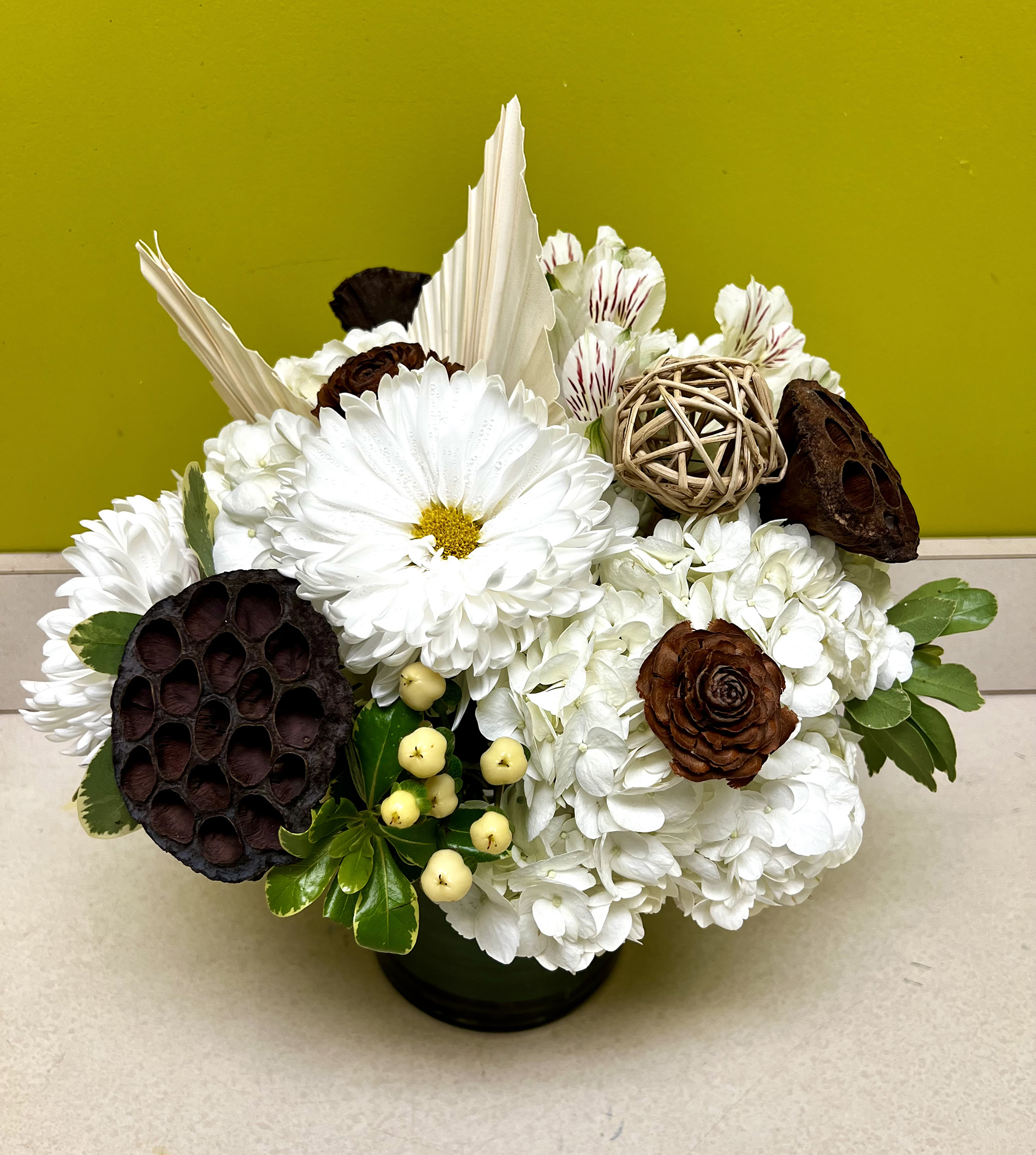Inspired by moonlit walks in the garden. Moonlight Muse features white blooms with rustic preserved elements. This beautiful arrangement will bring serenity to any room in your home.