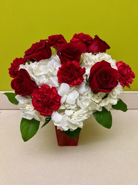 Roses and romance—always the perfect pair. This elegant arrangement features lush, passionate red roses accented with crisp red and white blooms, all artfully designed in a stylish red vase. Timeless, bold, and beautifully romantic, it’s the kind of gift that says everything—without needing a single word.
