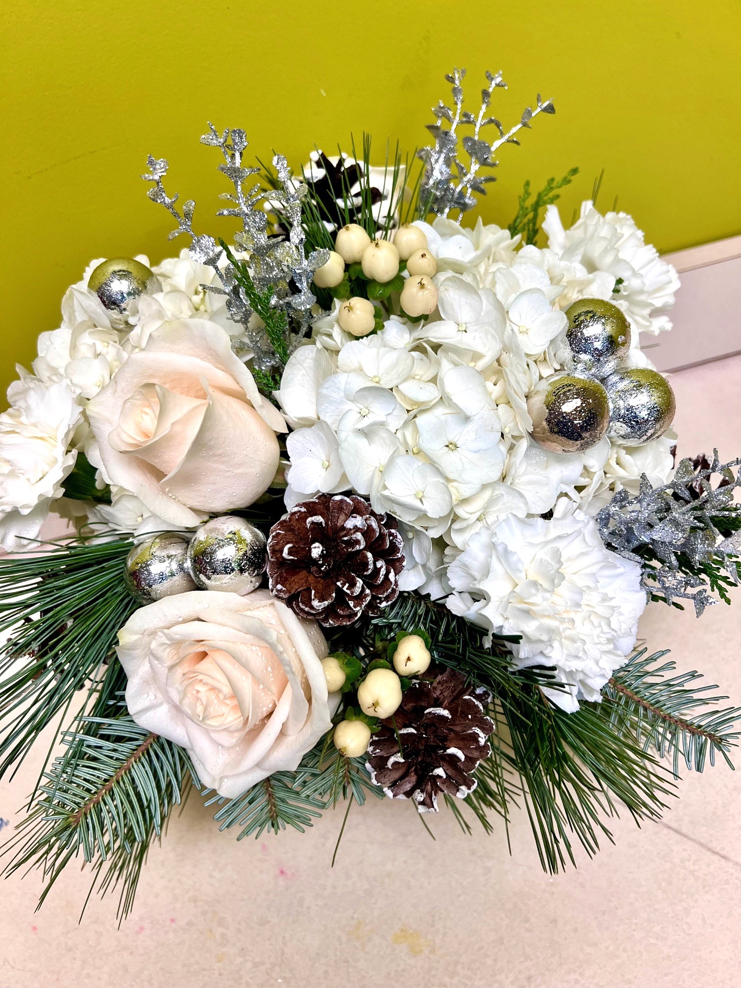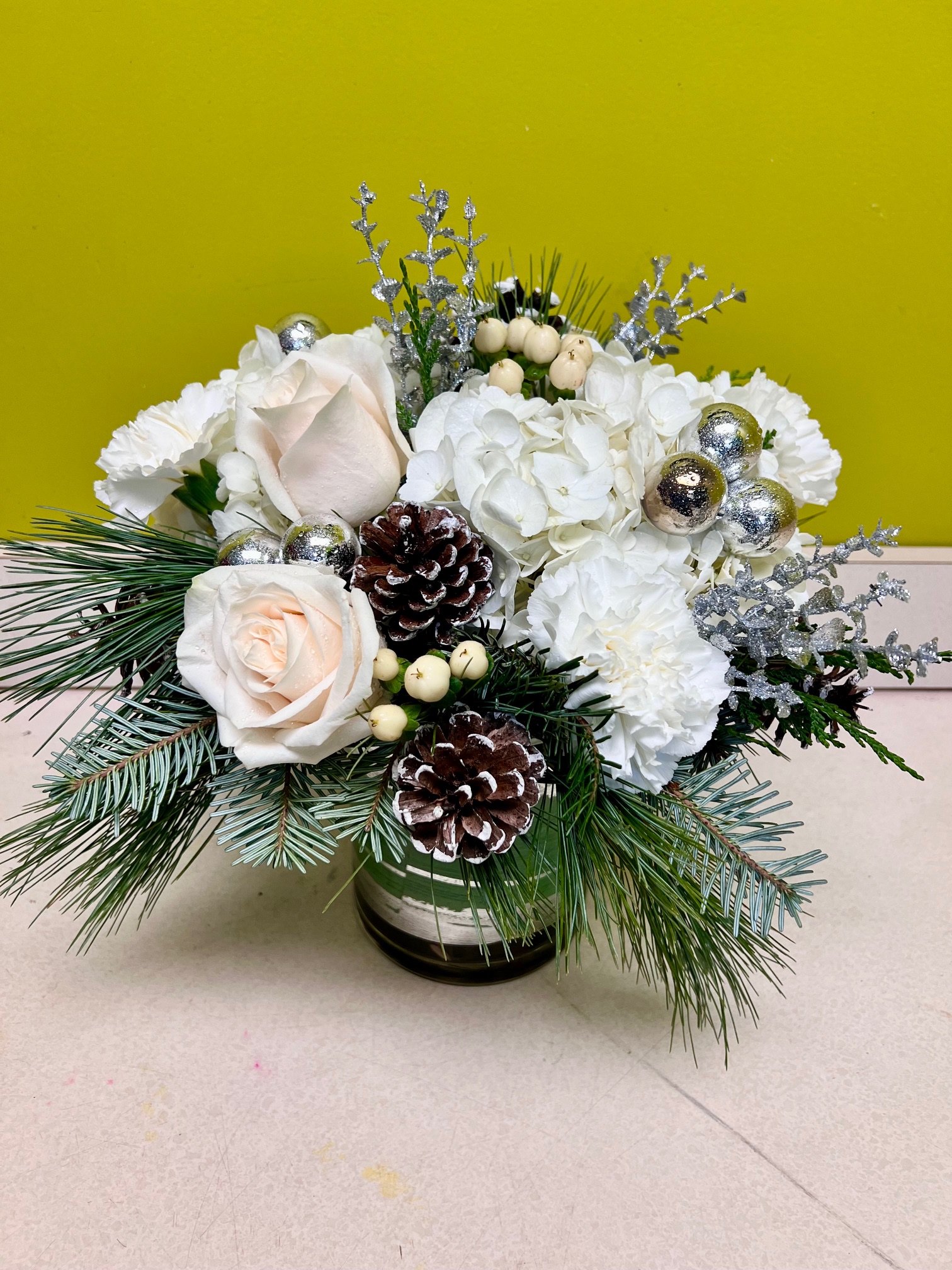 This refined holiday arrangement features delicate white and ivory florals nestled into fresh, fragrant evergreens. Accented with berries, pinecones, and silver balls, it’s a sophisticated way to celebrate the beauty of the season.