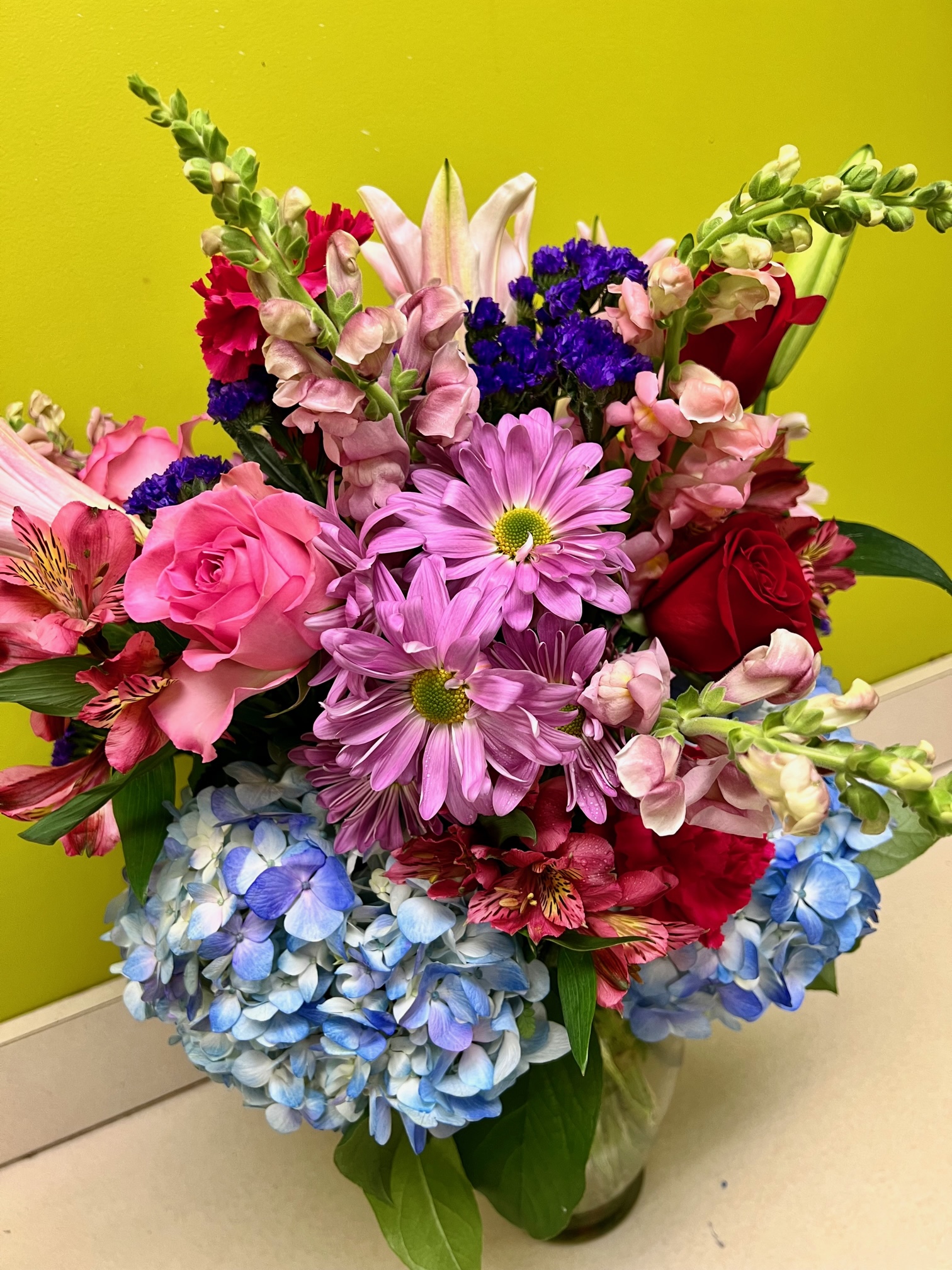 Filled with luscious blossoms including lilies, roses, hydrangea and seasonal favorites. Cheer someone up today with this best seller.