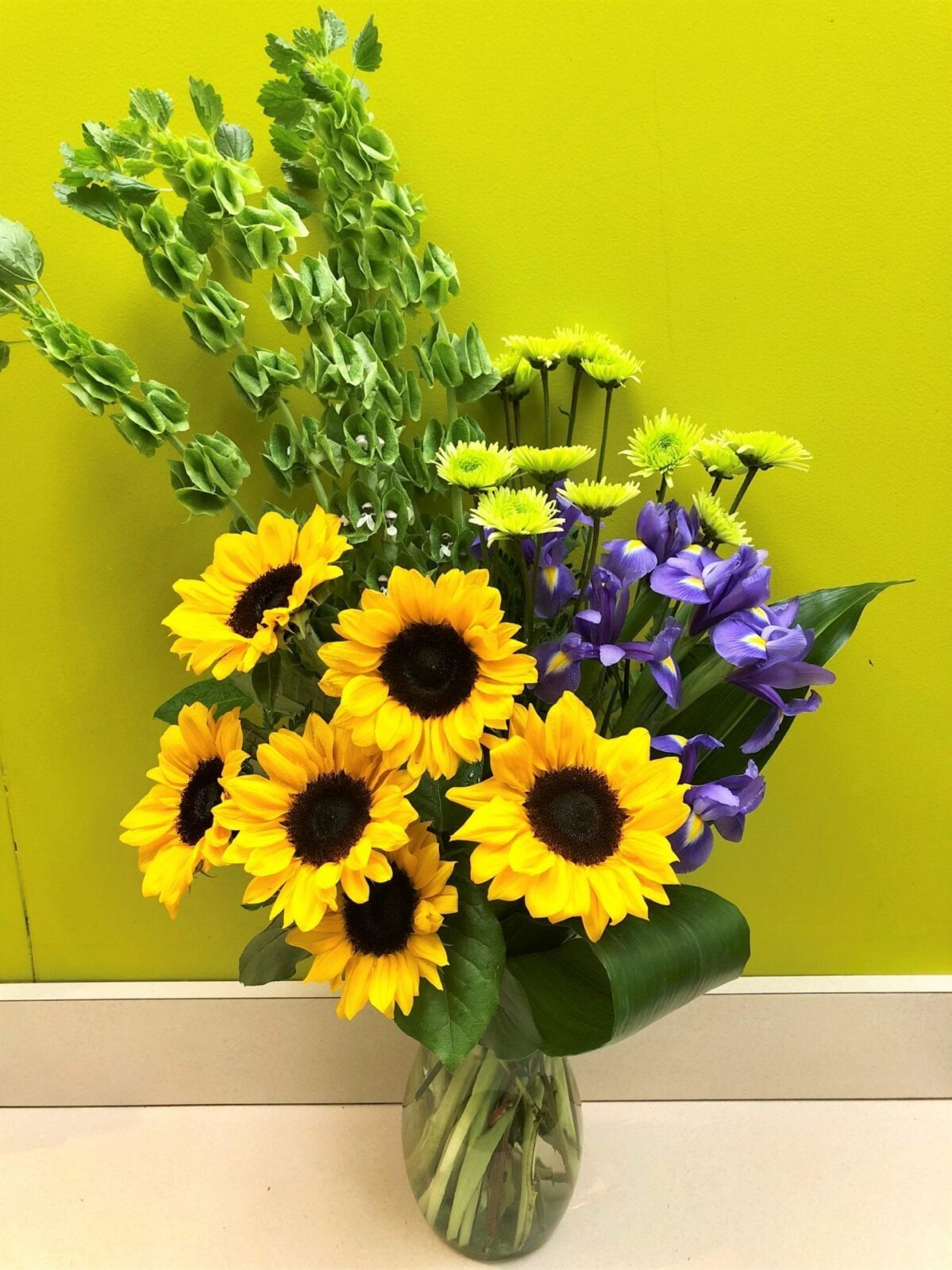 Pure sunshine in a vase. Artistically arranged with golden sunflowers, vibrant iris, fresh bells of Ireland, and a mix of beautiful seasonal blooms, this cheerful design is bursting with color, texture, and feel-good energy. Honestly… what could be happier? 🌻✨
