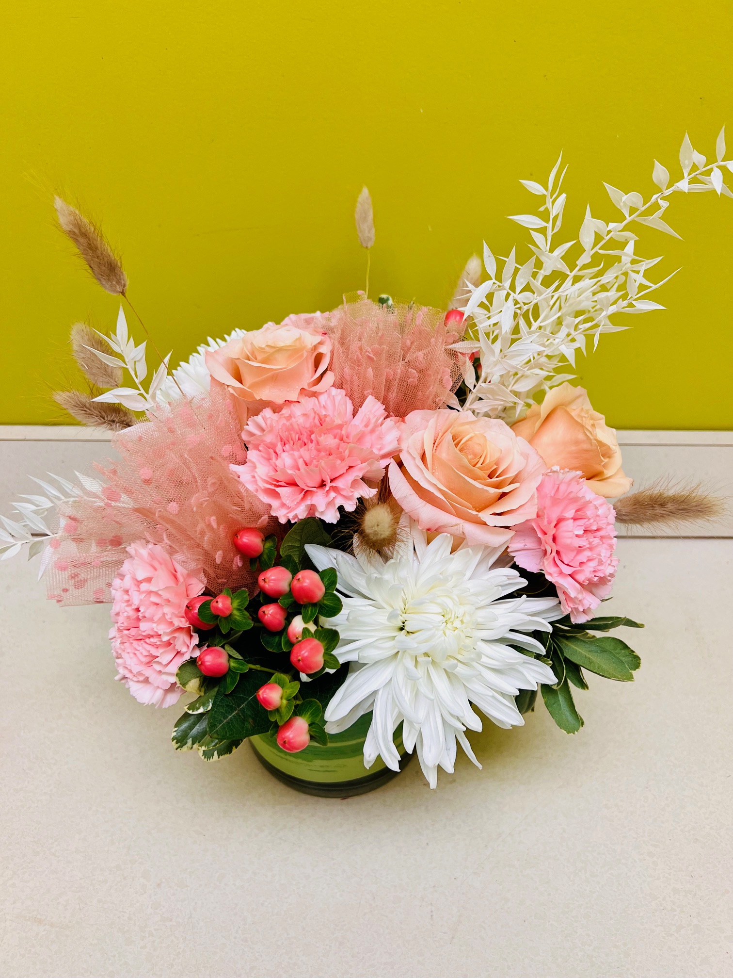 Soft and utterly feminine, these pastel blossoms blend together for an effect that is subtle and sublime. Tastefully arranged and complete with whimsical tulle touches.
