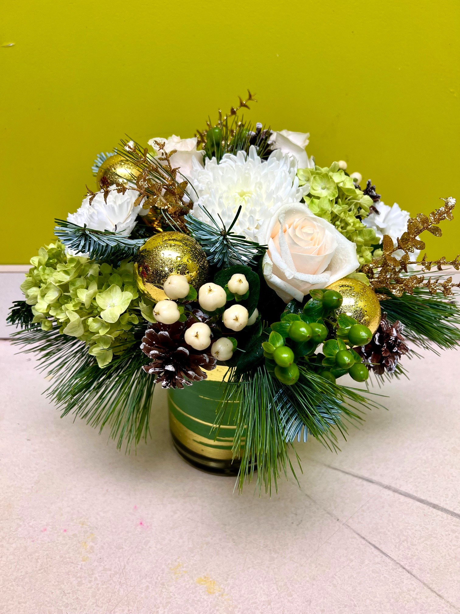 Wrapped in soft white and green blooms, this festive arrangement rests on fragrant evergreens and is completed with berries, pinecones, and gold balls. A cozy, nature-inspired piece perfect for holiday gatherings or seasonal décor.